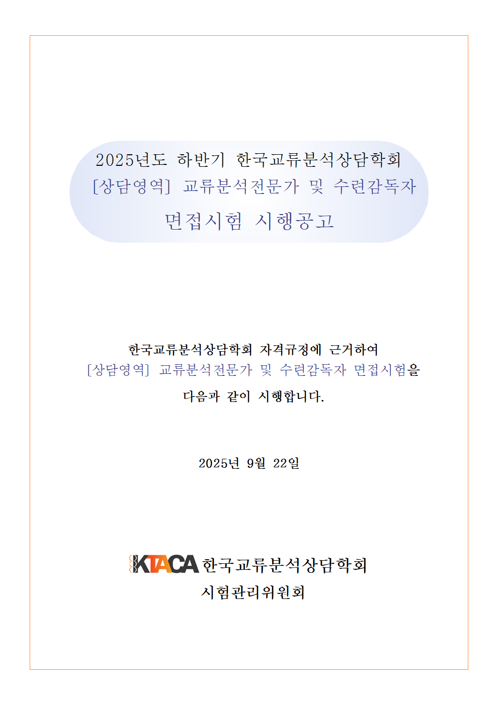 | [´ÙÀ½] KTACA ±³·ùºÐ¼®»ó´ã¿µ¿ª Àü¹®°¡ ¹× ¼ö·Ã°¨µ¶ÀÚ ¼ö·Ã.. 2025-09-19 |