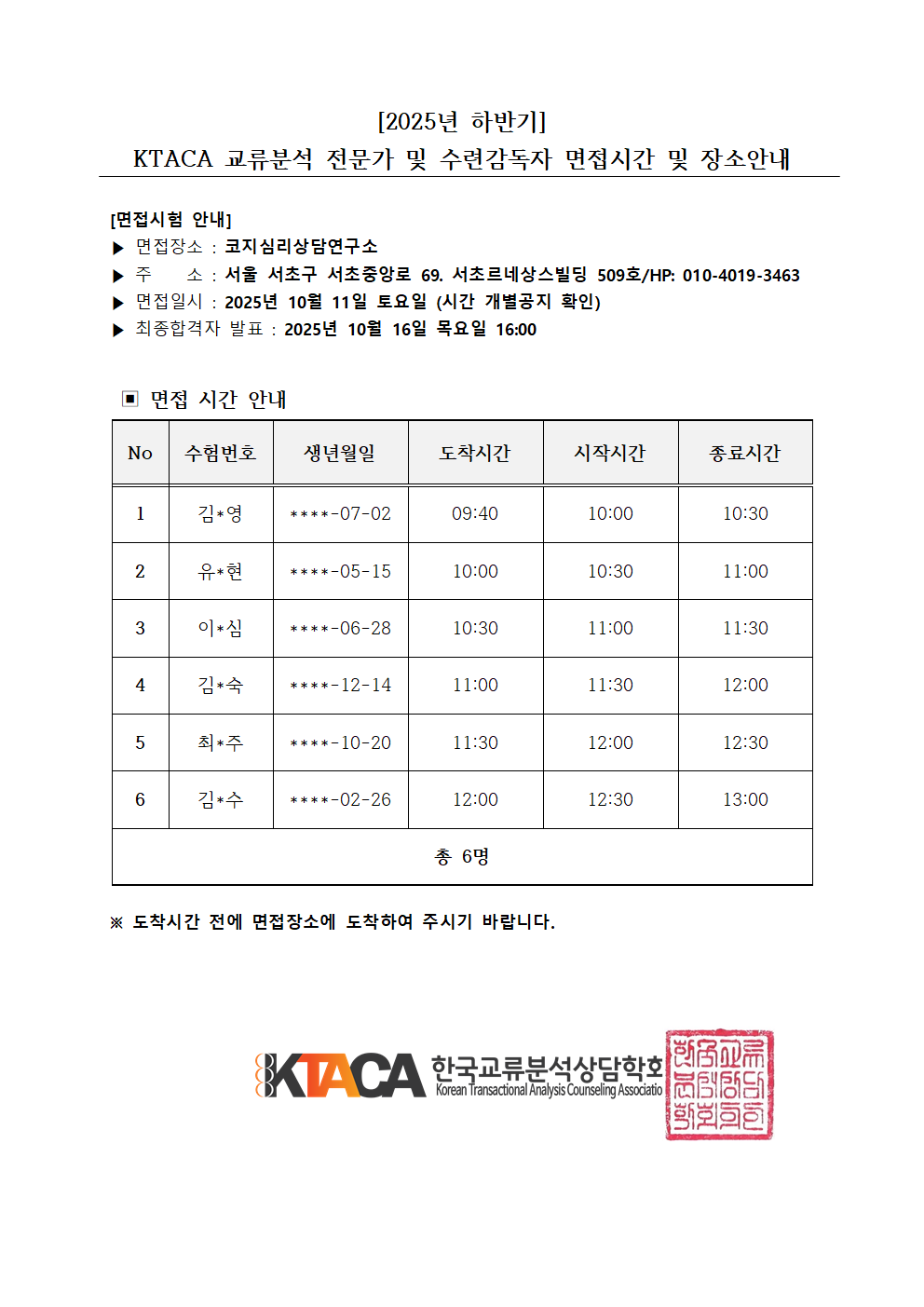 - [2025³â ÇϹݱâ] KTACA ±³·ùºÐ¼® Àü¹®°¡ ¹× ¼ö·Ã°¨µ¶ÀÚ ¸éÁ¢½Ã°£ ¹× Àå¼Ò¾È³»