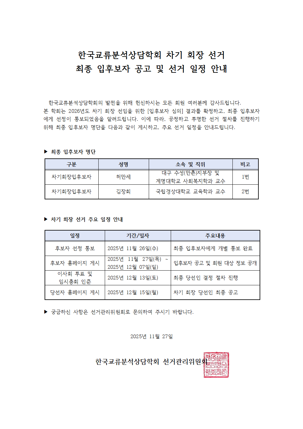 - Çѱ¹±³·ùºÐ¼®»ó´ãÇÐȸ Â÷±â ȸÀå ¼±°Å ÃÖÁ¾ ÀÔÈĺ¸ÀÚ °ø°í ¹× ¼±°Å ÀÏÁ¤ ¾È³»