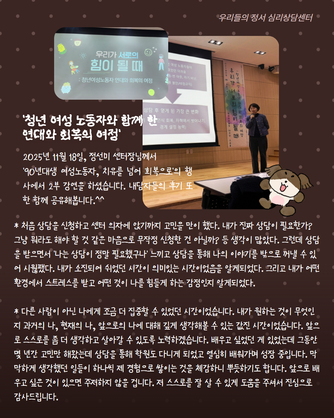 - [¿ëÀμöÁöÁöºÎ]¿ì¸®µéÀÇÁ¤¼½É¸®»ó´ã¼¾ÅÍ Nov. ´º½º·¹ÅÍ
